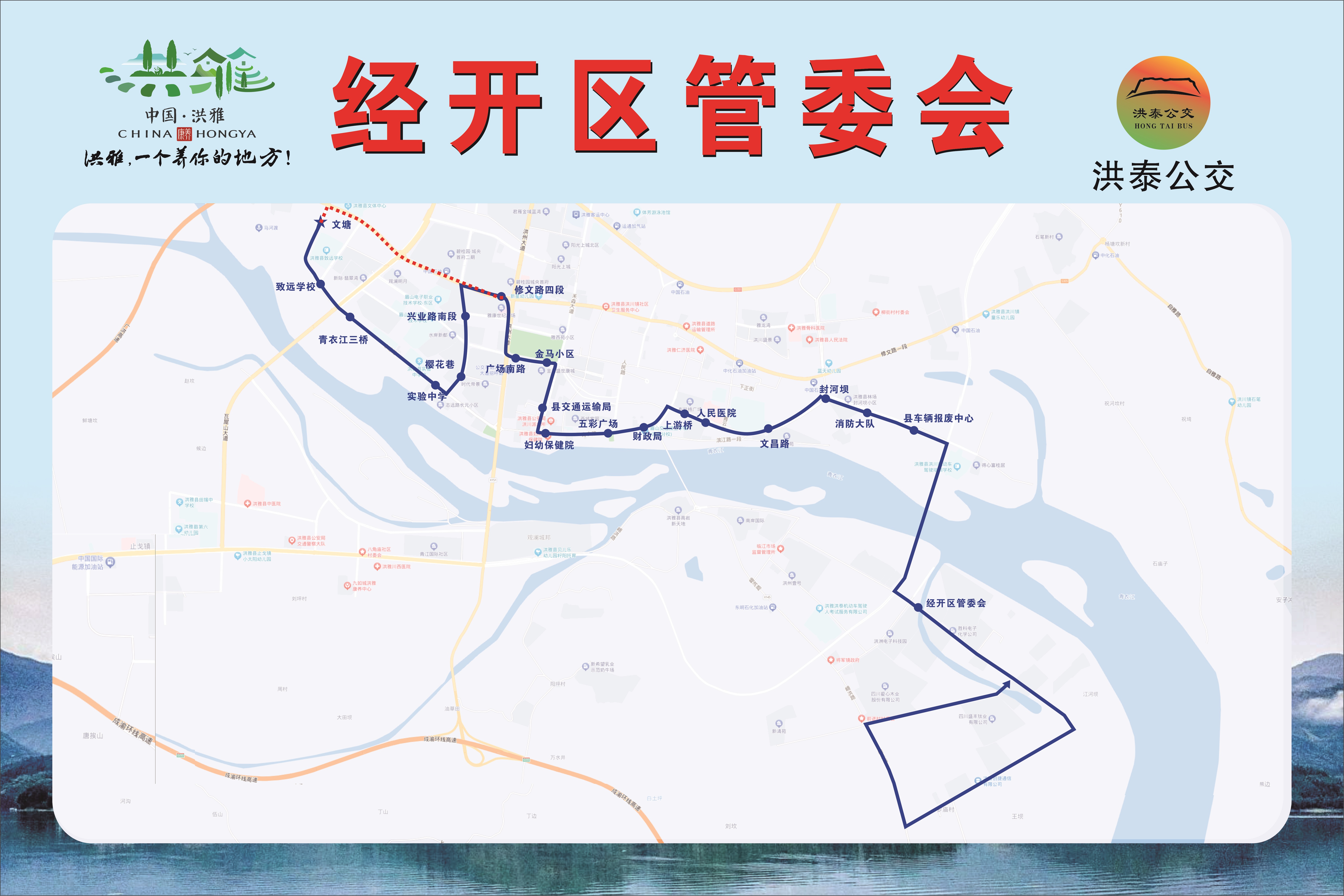 注:因洪雅城市防水排涝设施综合整治项目将致远路段断道施工,即日起至8月30日,经开区专线临时取消致远学校、青衣江三桥、实验中学、樱花巷、兴业路南段5个站点,线路由文塘站点直接行驶至修文路四段站(中间不设站点、不停留),具体行驶线路见地图中红色虚线处。施工完毕后,自行恢复原线路。