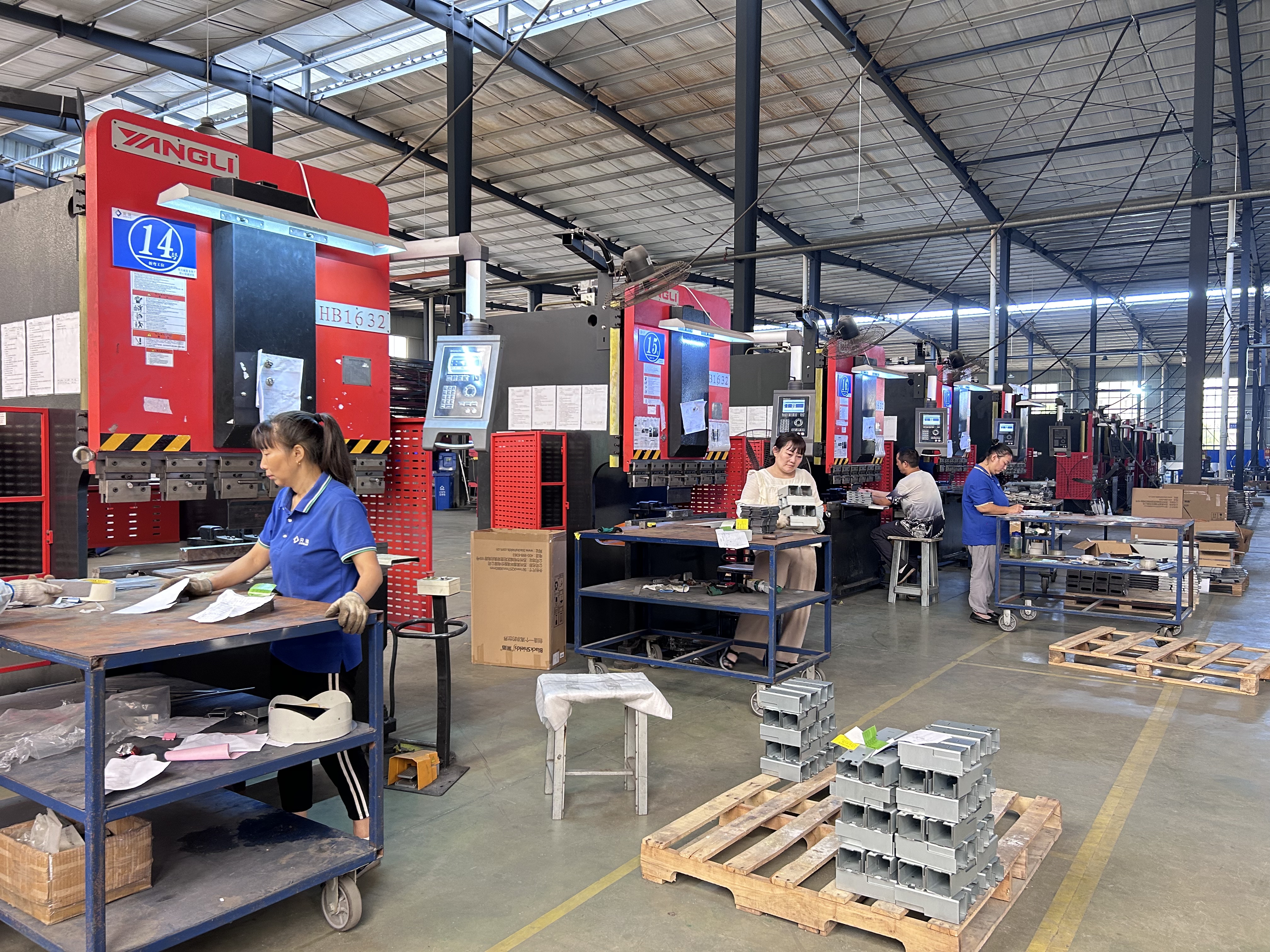在公司前段车间,一排全自动折弯机械手臂设备正在全自动折弯,生产着新能源机箱机柜和高端智能售货机。通过数字化平台,工人设置好操作口令,机械手臂24小时全自动进行操作,大大提高了工作效率。