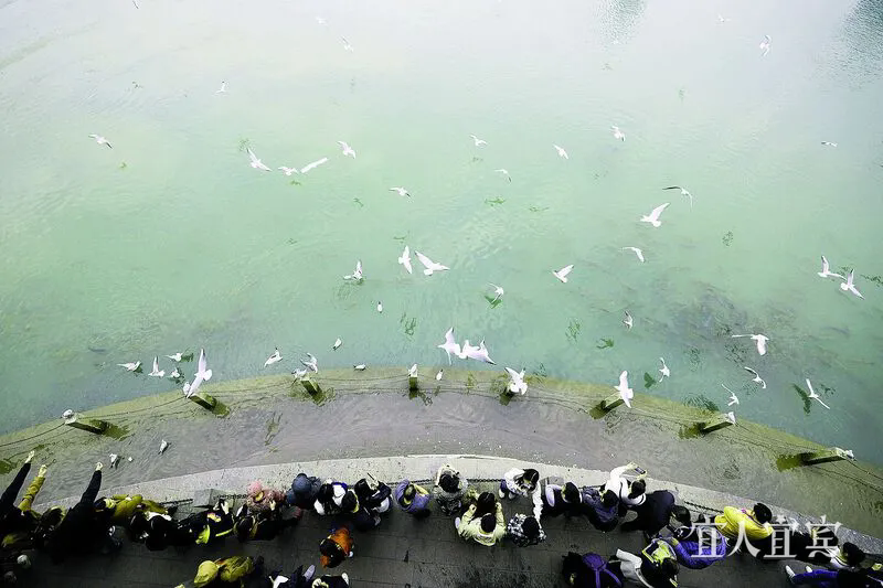 市民在三江口围观“鸥翔鱼跃长江头”