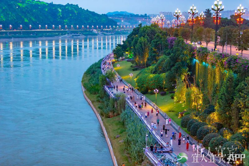 华灯初上,宜宾三江口的长江公园游人如织