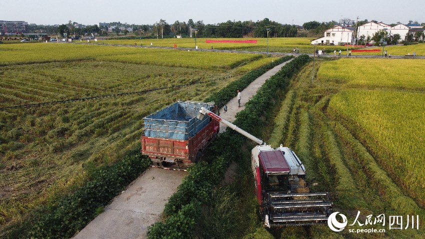 仁寿县方家镇水池村收割机正在平整的稻田里收获稻谷。仁寿县委宣传部供图