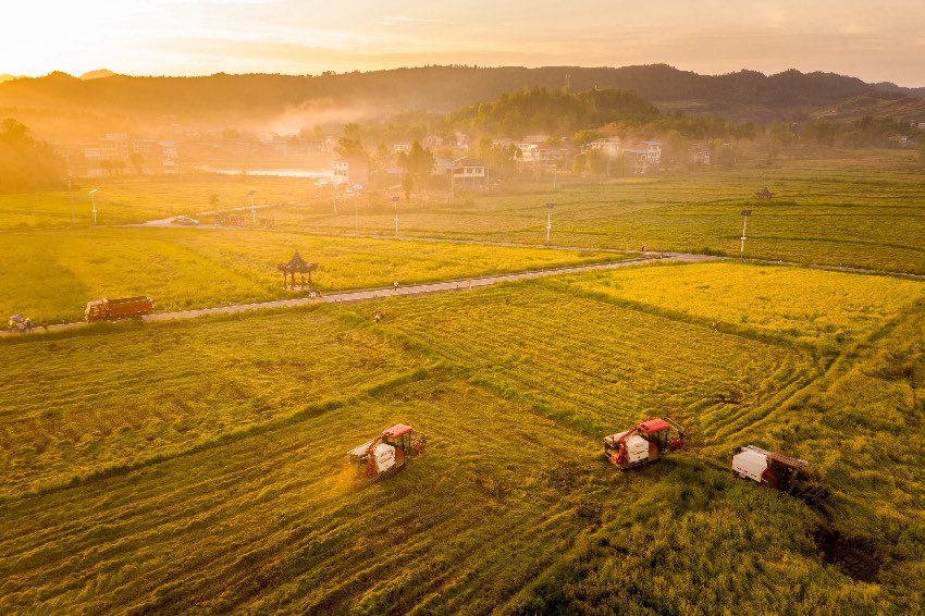 又到了丰收季,成都新都区的万亩稻田里一片繁忙的景象,金色稻浪铺满大地,丰收美景引人停留。