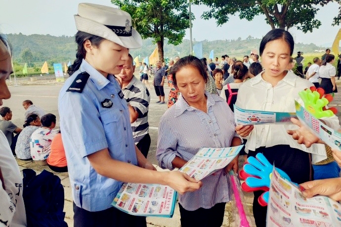 除了主会场的安保工作外,洪雅公安还承担着各分会场和特色农产品展销现场的安保任务。他们穿梭在人群和摊位之间,维护着现场的秩序和安全。同时,在丰收节活动现场,洪雅公安不失时机以摆放展板、发放宣传彩页等形式,开展禁毒、防诈反诈、交通安全等宣传,面对面向游客详细讲解常见的诈骗手段及近期发生的真实案例,切实提高群众防骗意识,保证群众财产安全不受损失。