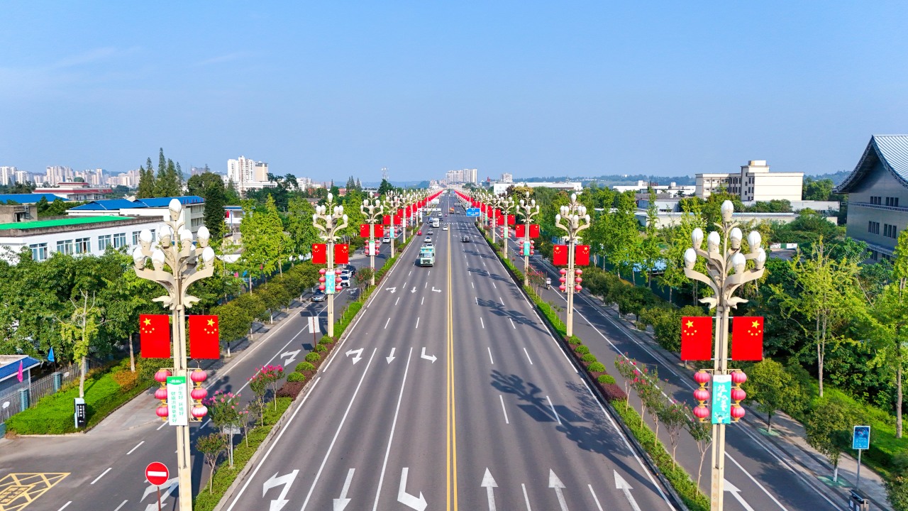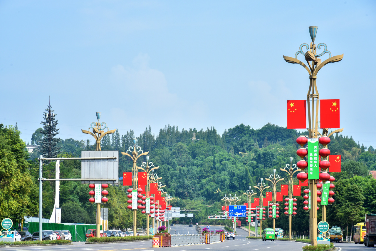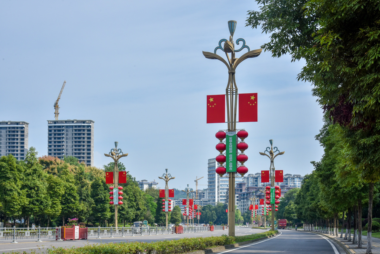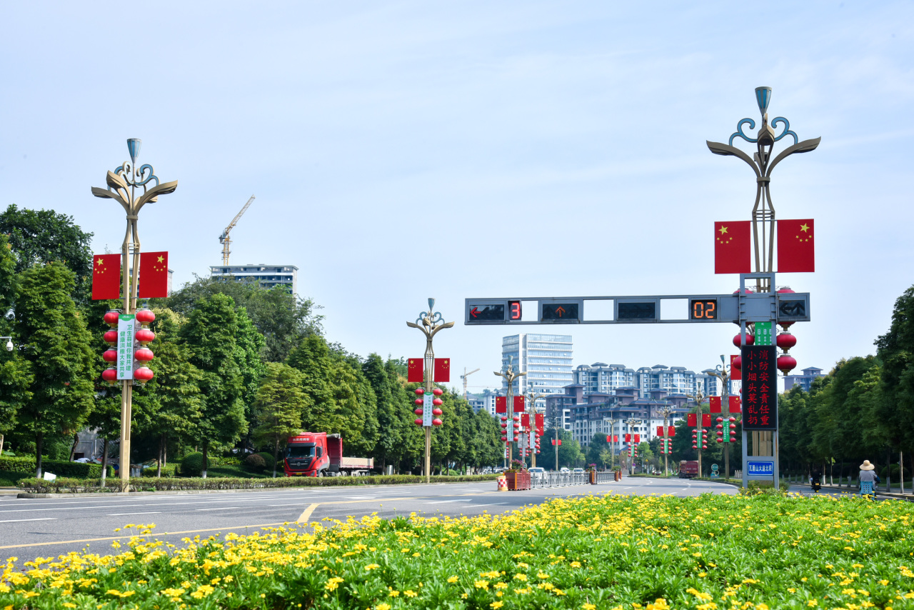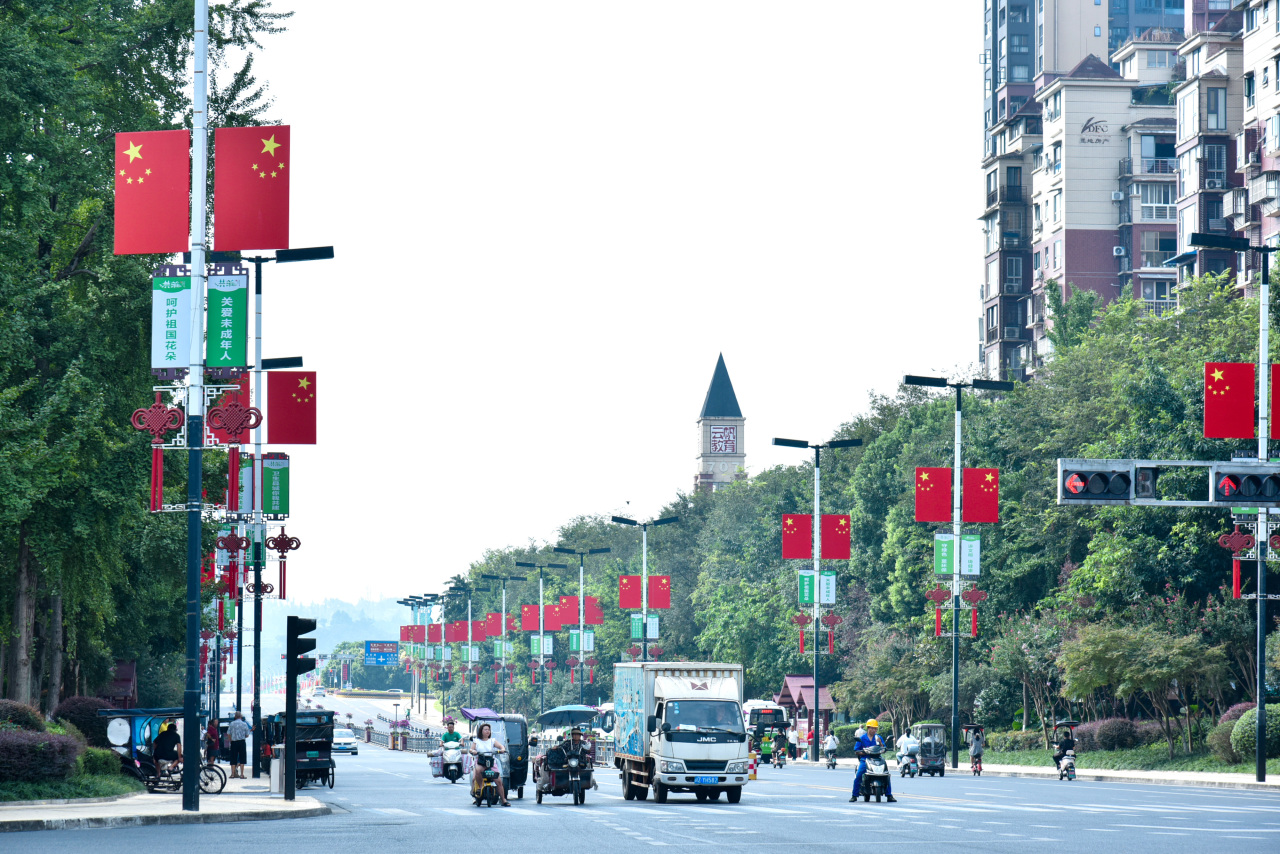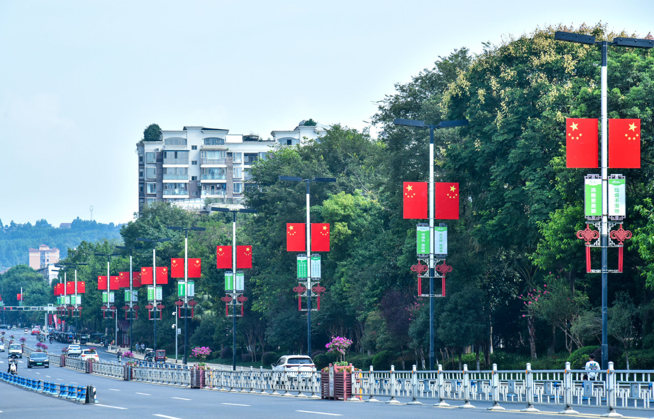 洪雅以满城的五星红旗为笔