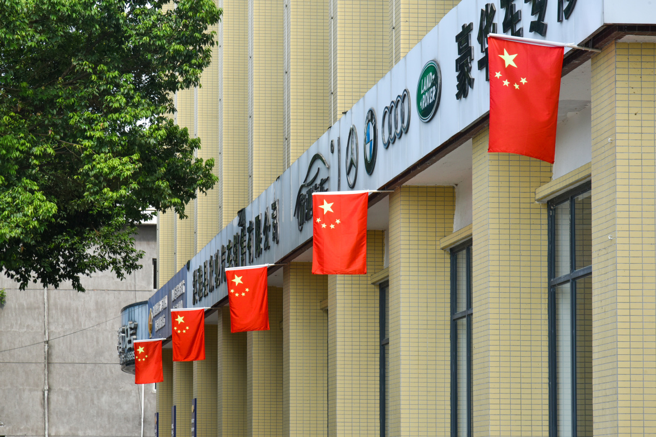 沿街的商铺、小区或悬挂国旗