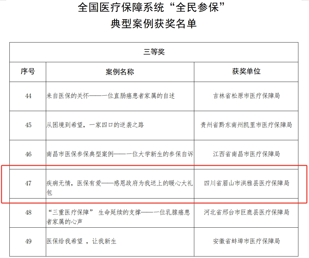 近日,国家医保局公布“全民参保”典型案例获奖名单,我县参保案例《疾病无情,医保有爱——感恩政府为我送上的暖心大礼》荣获全国医疗保障系统三等奖。