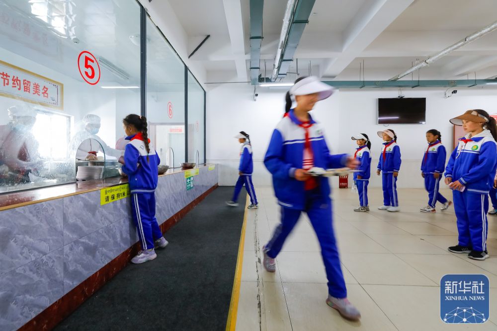 9月27日,道孚县城关第一完全小学的寄宿制学生在食堂领取免费午餐。
