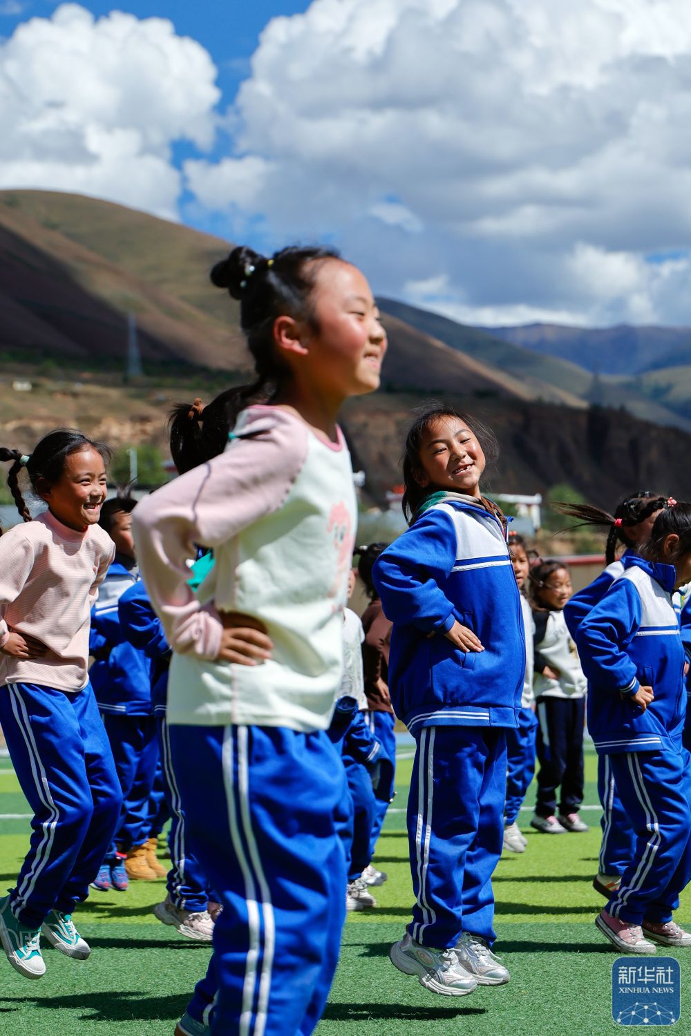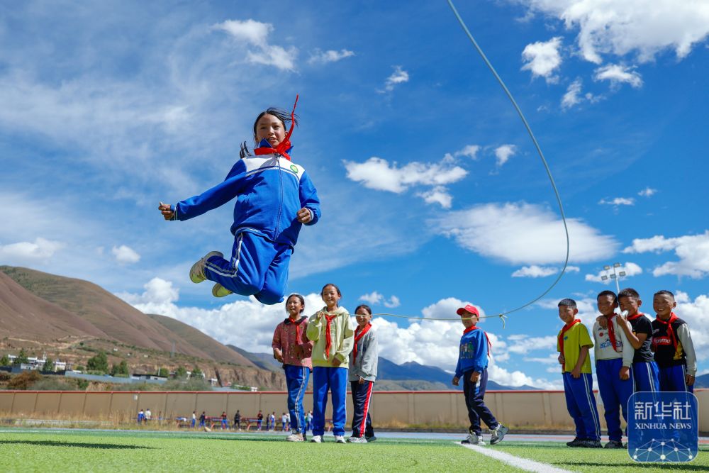 9月27日,道孚县城关第一完全小学的学生在体育课上跳绳。