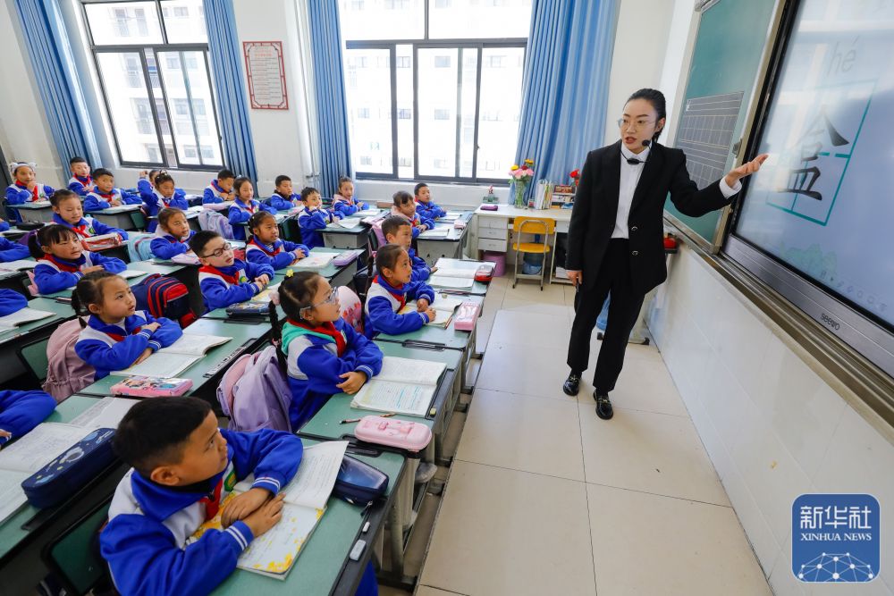 9月27日,在道孚县城关第一完全小学,语文老师肖红霞给采取普通模式教学的三年级一班的学生们进行重难点字书写指导。
