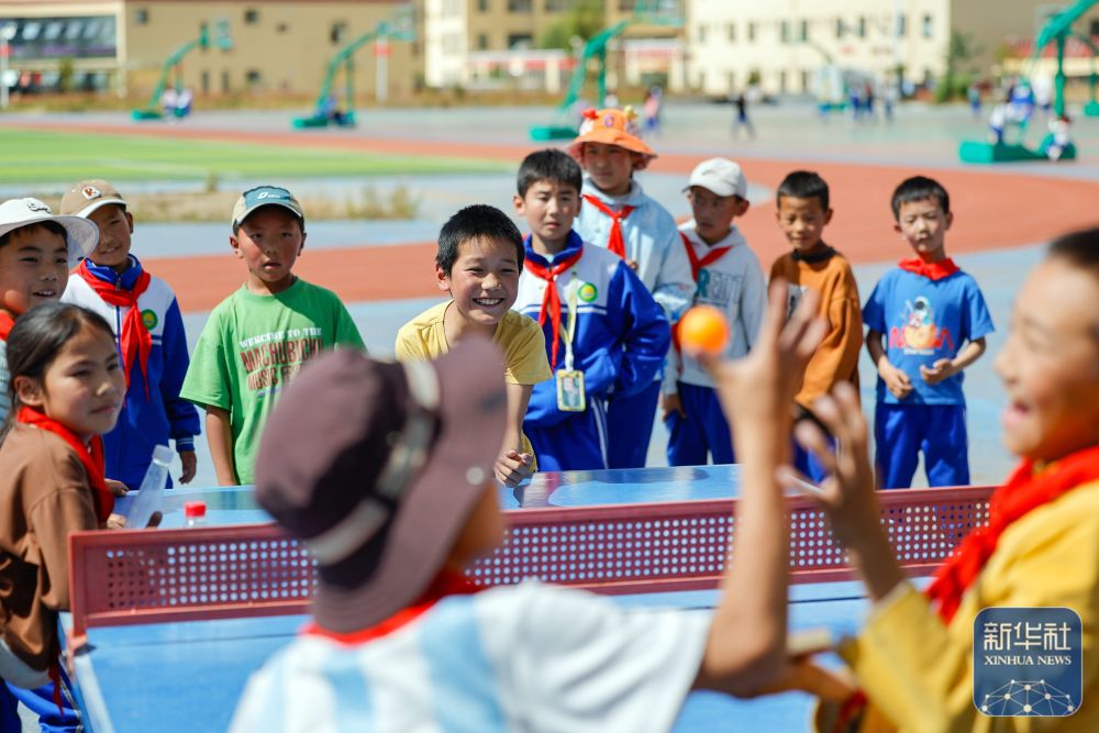 9月27日,道孚县城关第一完全小学的学生在体育课上打乒乓球。