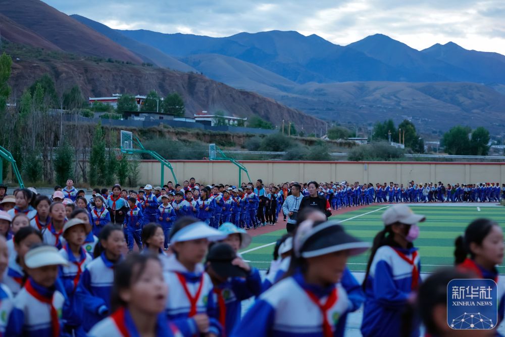 9月28日清晨,道孚县城关第一完全小学的寄宿制学生起床后在操场上跑早操。