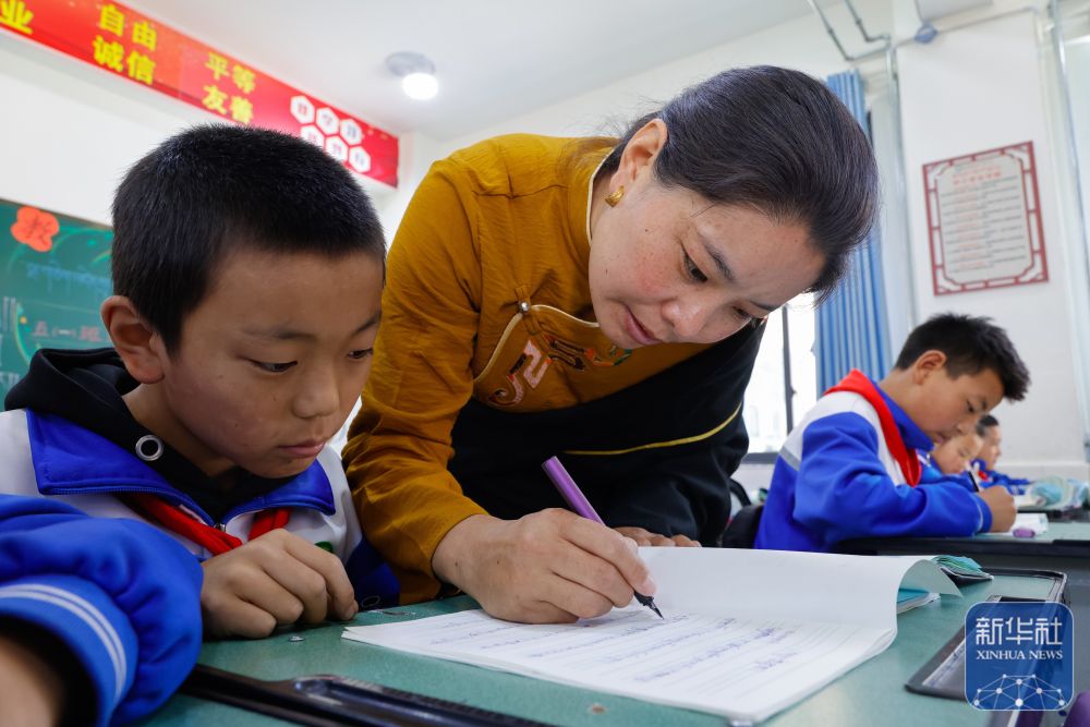 9月27日,在道孚县城关第一完全小学,采取“藏加模式”教学的五年级一班的藏语文课上,准木周老师帮一名藏族学生修改藏语文作文。