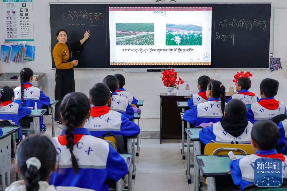 9月27日,在道孚县城关第一完全小学,采取“藏加模式”教学的五年级一班的藏语文课上,准木周老师指导藏族学生以家乡草原风物为主题写作藏语文作文。