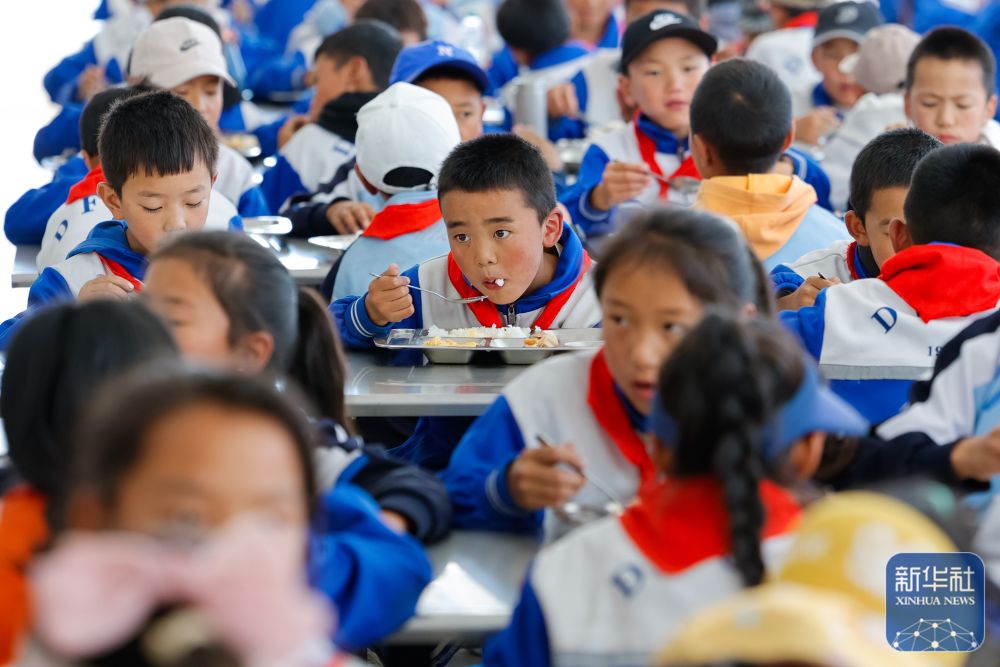 9月27日,道孚县城关第一完全小学的低年级学生在食堂吃免费午餐。