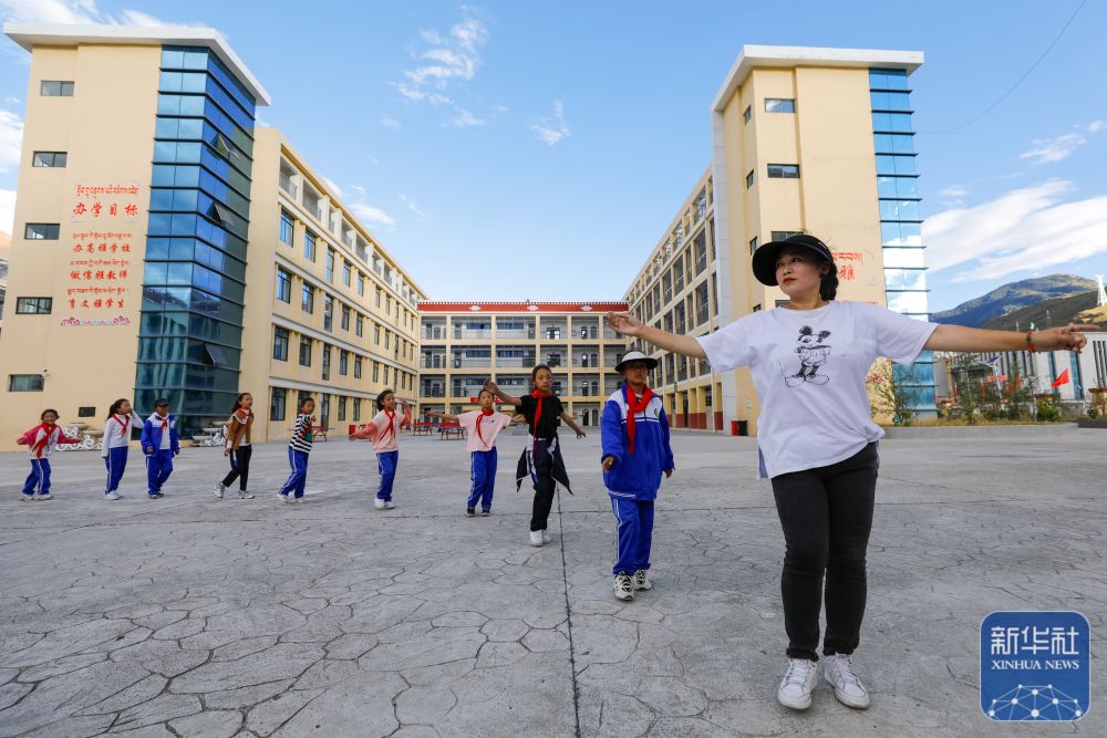 9月27日,道孚县城关第一完全小学的苟淑慧老师(右一)带领学生练习跳锅庄。