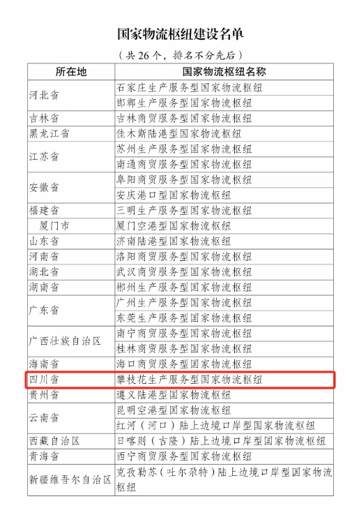 据国家发展改革委微信公众号消息,为深入贯彻党的二十大精神,落实“十四五”规划《纲要》和《“十四五”现代物流发展规划》等有关工作部署,近日国家发展改革委研究确定并发布新一批国家物流枢纽建设名单,石家庄生产服务型、武汉商贸服务型、攀枝花生产服务型等26个国家物流枢纽入选。其中,从地区分布看,东部地区10个、中部地区5个、西部地区9个、东北地区2个;从枢纽类型看,陆港型3个、空港型2个、港口型1个、生产服务型8个、商贸服务型9个、陆上边境口岸型3个。