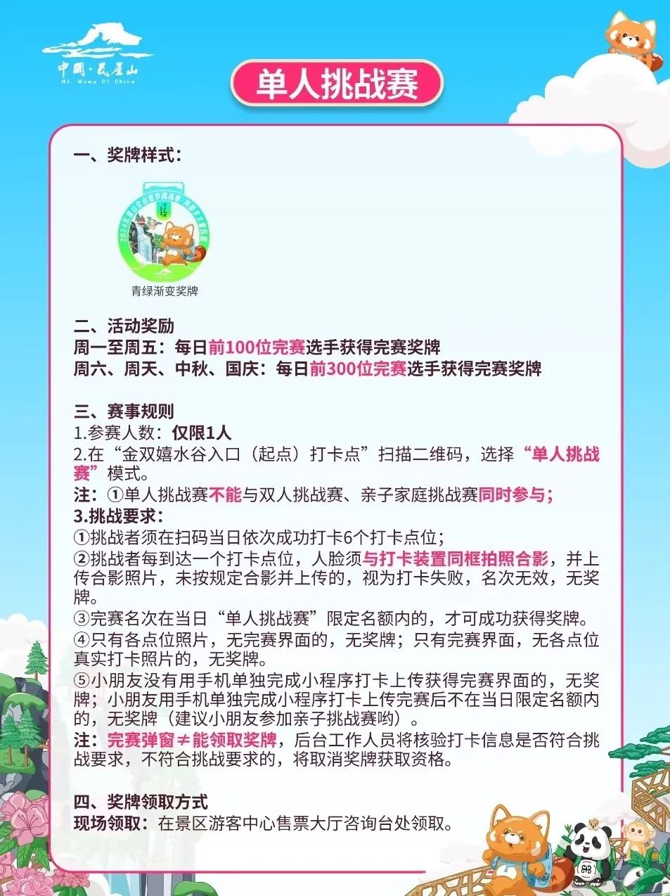 ✅金双嬉水谷入口打卡点--✅瓦屋山大峡谷打卡点--✅珙桐栈道打卡点(💓注:亲子挑战赛无需完赛界面,小程序打卡页面显示已完成3个点位打卡记录的,即可领取奖牌)。
