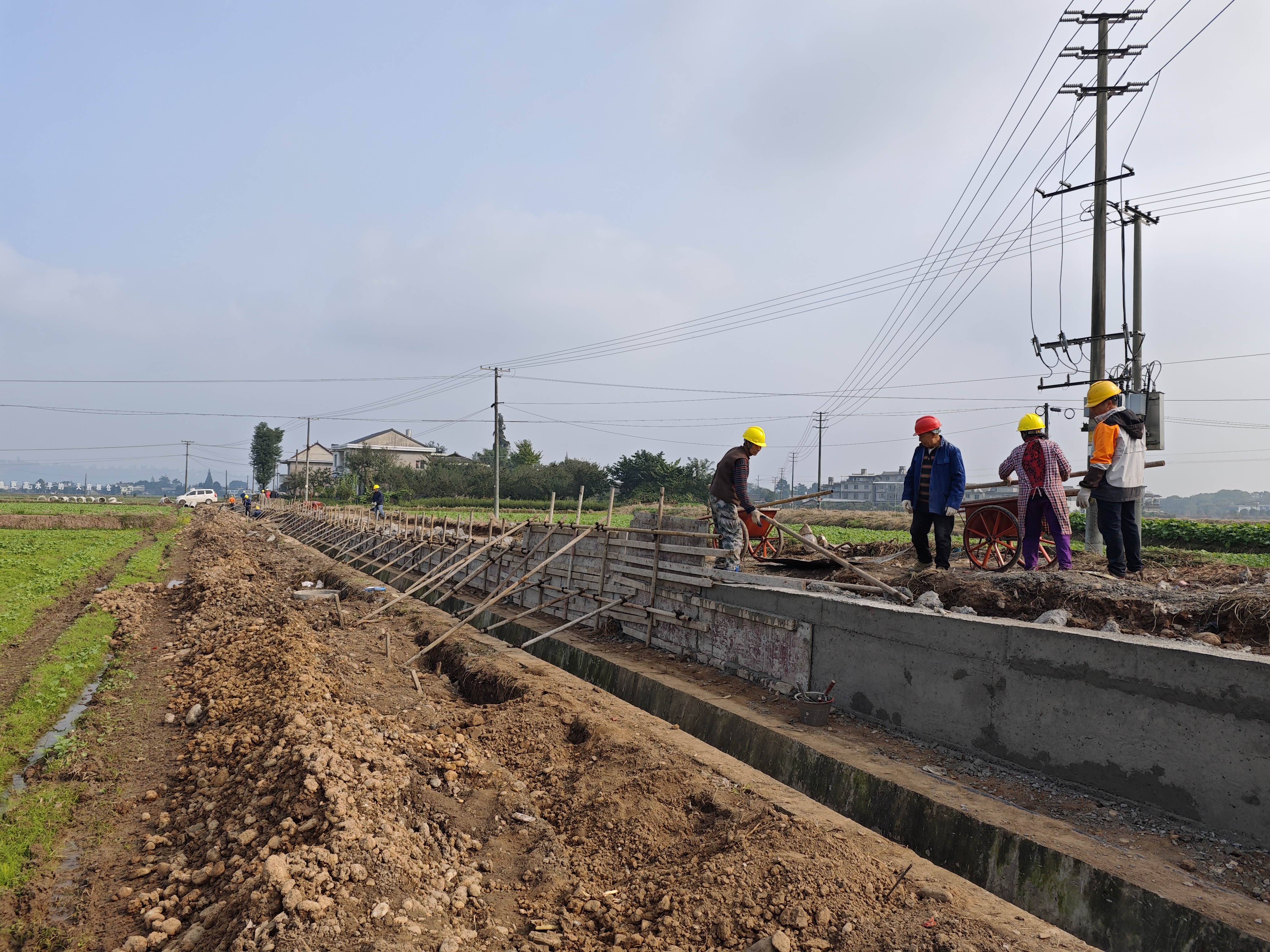 近日,记者在止戈镇安宁村2024年宜居宜业和美乡村建设项目现场看到,挖掘机在清理破损的入户水泥路面,工人们正在进行路肩支模和排污管道埋设施工,整个项目有序推进。