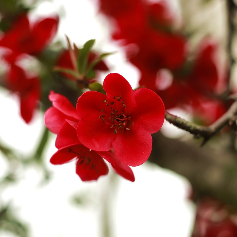 红梅的花朵饱满而艳丽,深红的花瓣层层叠叠,如同火焰般炽热,金黄的花蕊点缀其中,散发着阵阵清幽的香气。它们在枝头傲然挺立,不畏严寒,在料峭春寒中尽情释放着生命的激情。