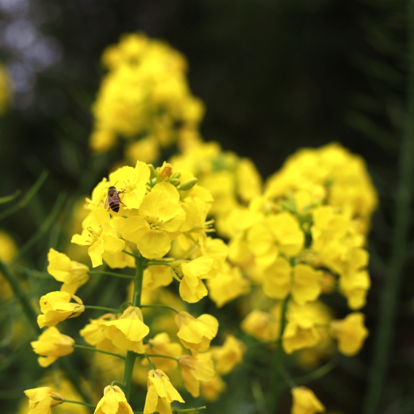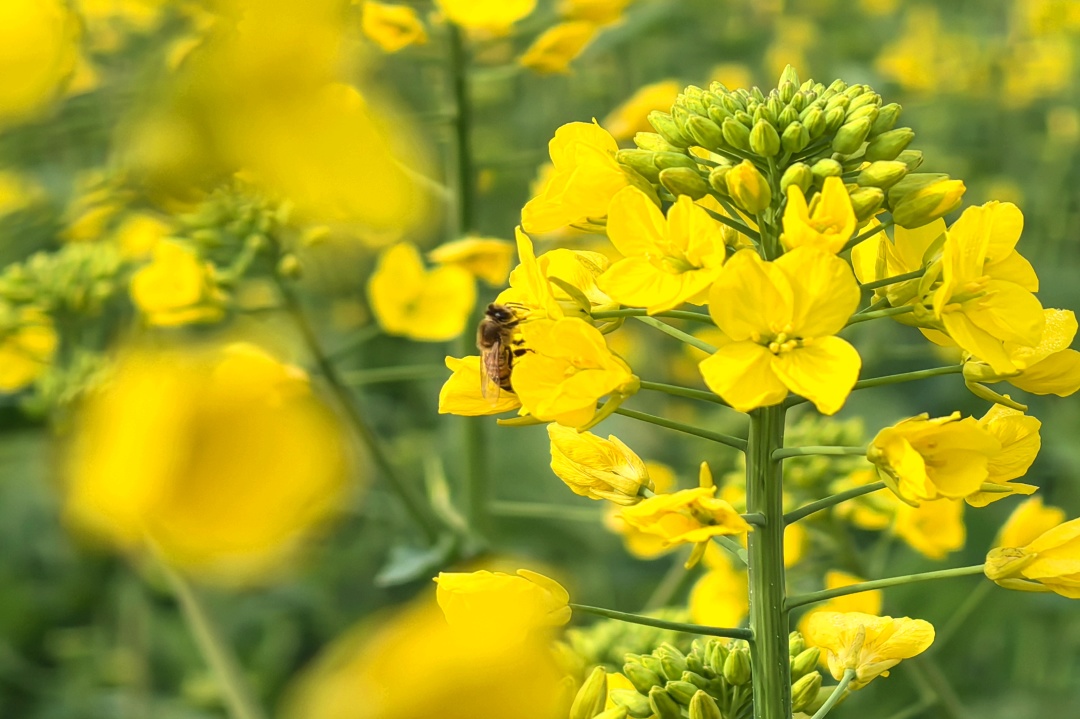 微风拂过,花海泛起层层波浪,空气中弥漫着淡淡的甜香,仿佛连风都被染成了金色。蜜蜂在花间穿梭,翅膀振动的声音与花香交织,奏响了一曲春天的交响乐。
