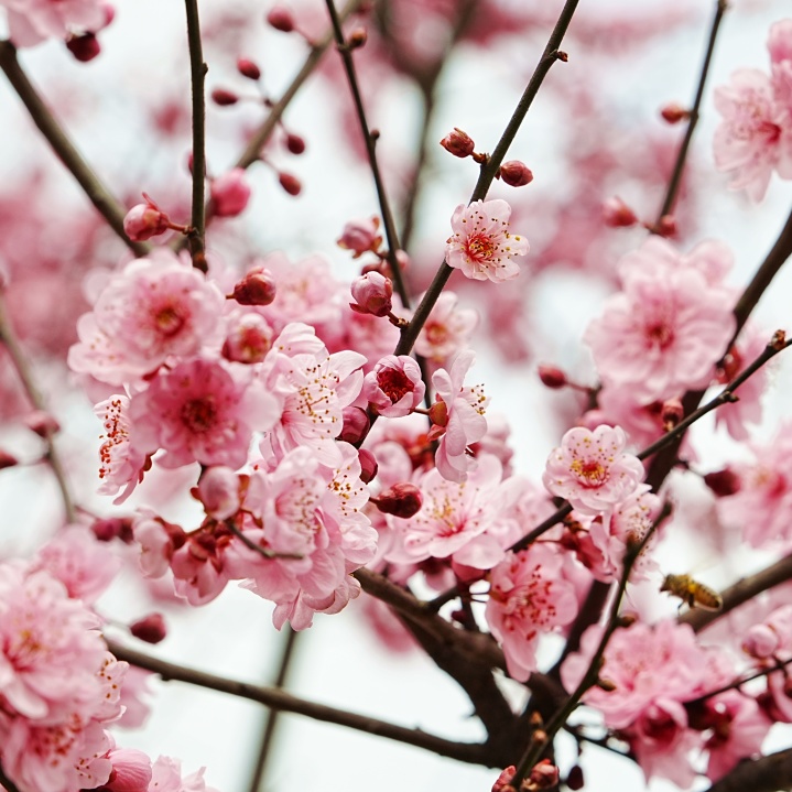 走近看,枝条上一簇簇绽放的花朵,随风舞动,白里透粉,娇艳动人。让人忍不住想要定格下这春意满满的画面。
