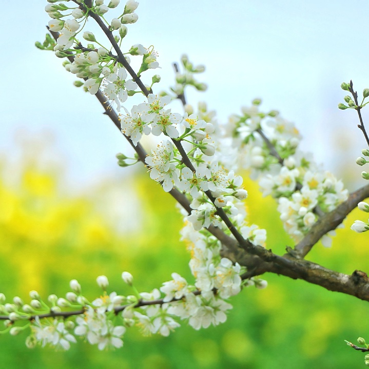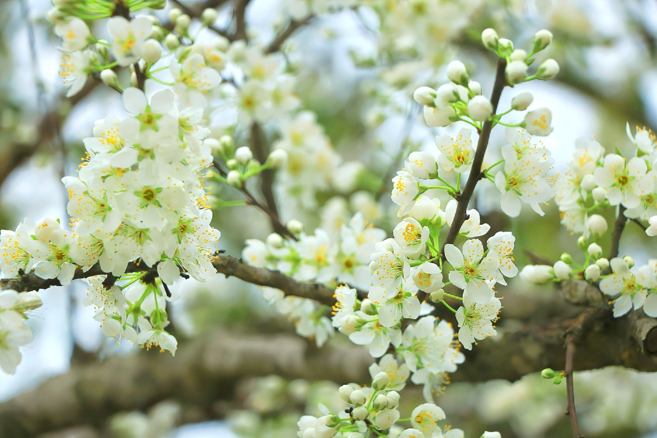 洁白的李花纯净无瑕,如同冬日残留的积雪,在春日的暖阳下闪烁着柔和的光芒。每一朵李花都小巧精致,花蕊纤细,散发出淡雅的清香。满树的李花像是为树木披上了一层洁白的婚纱,微风拂过,花瓣如雪花般飘落,如梦如幻。