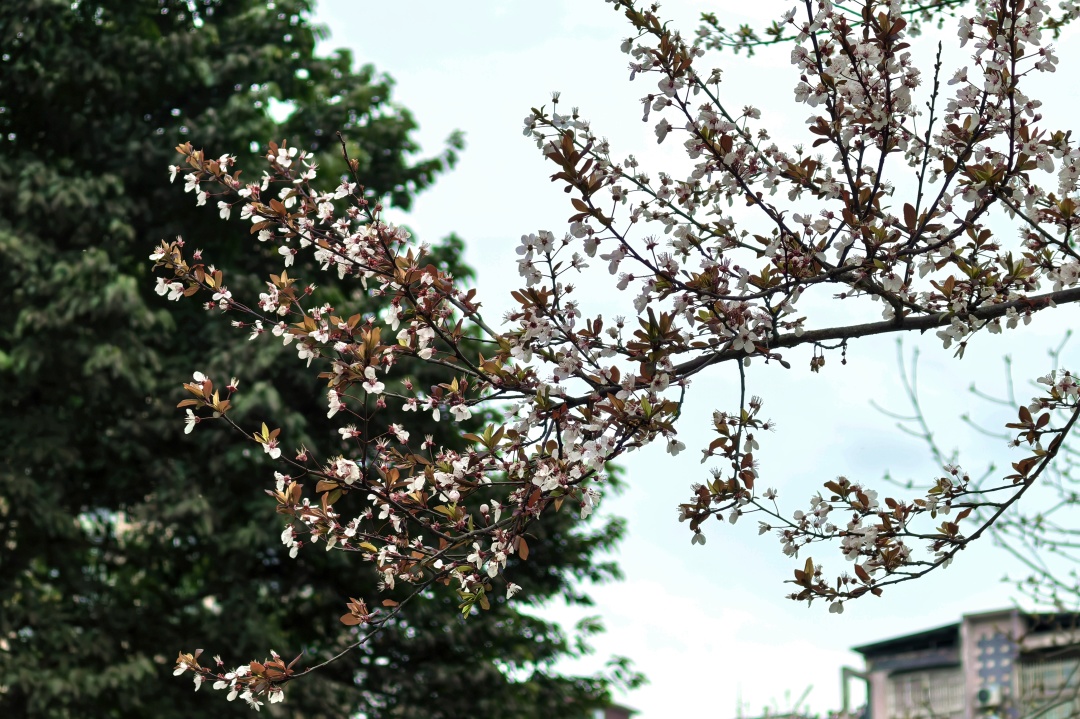紫叶李花朵小巧玲珑,洁白中带着淡淡的粉晕,像是大自然用最细腻的笔触在枝头点染而成,在紫红色叶片的映衬下,更显清新脱俗。