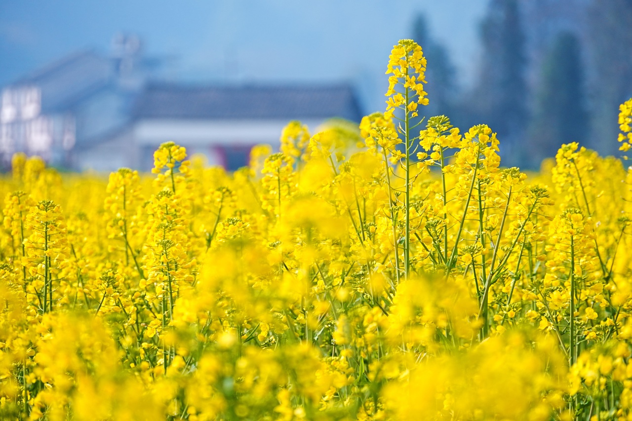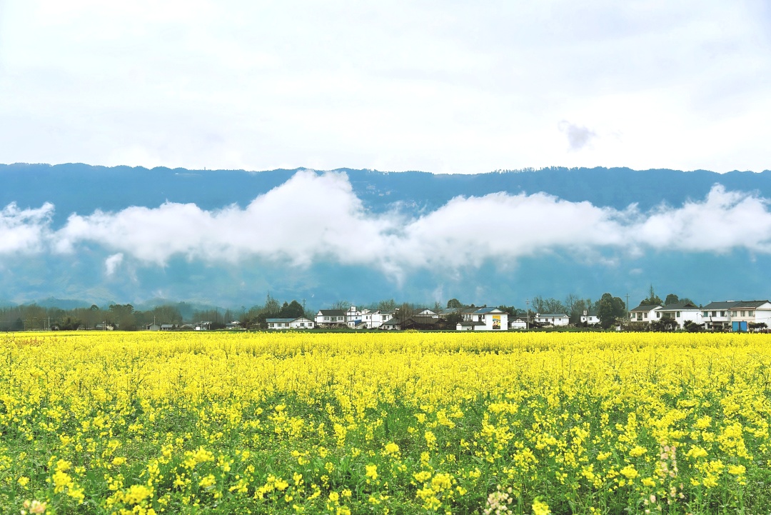 在洪雅的春日里,油菜花是最热烈的诗人,它们以最纯粹的金黄书写着大地的诗篇。成片的油菜花田铺展在山野之间,仿佛一块巨大的金色绸缎,在阳光下熠熠生辉。