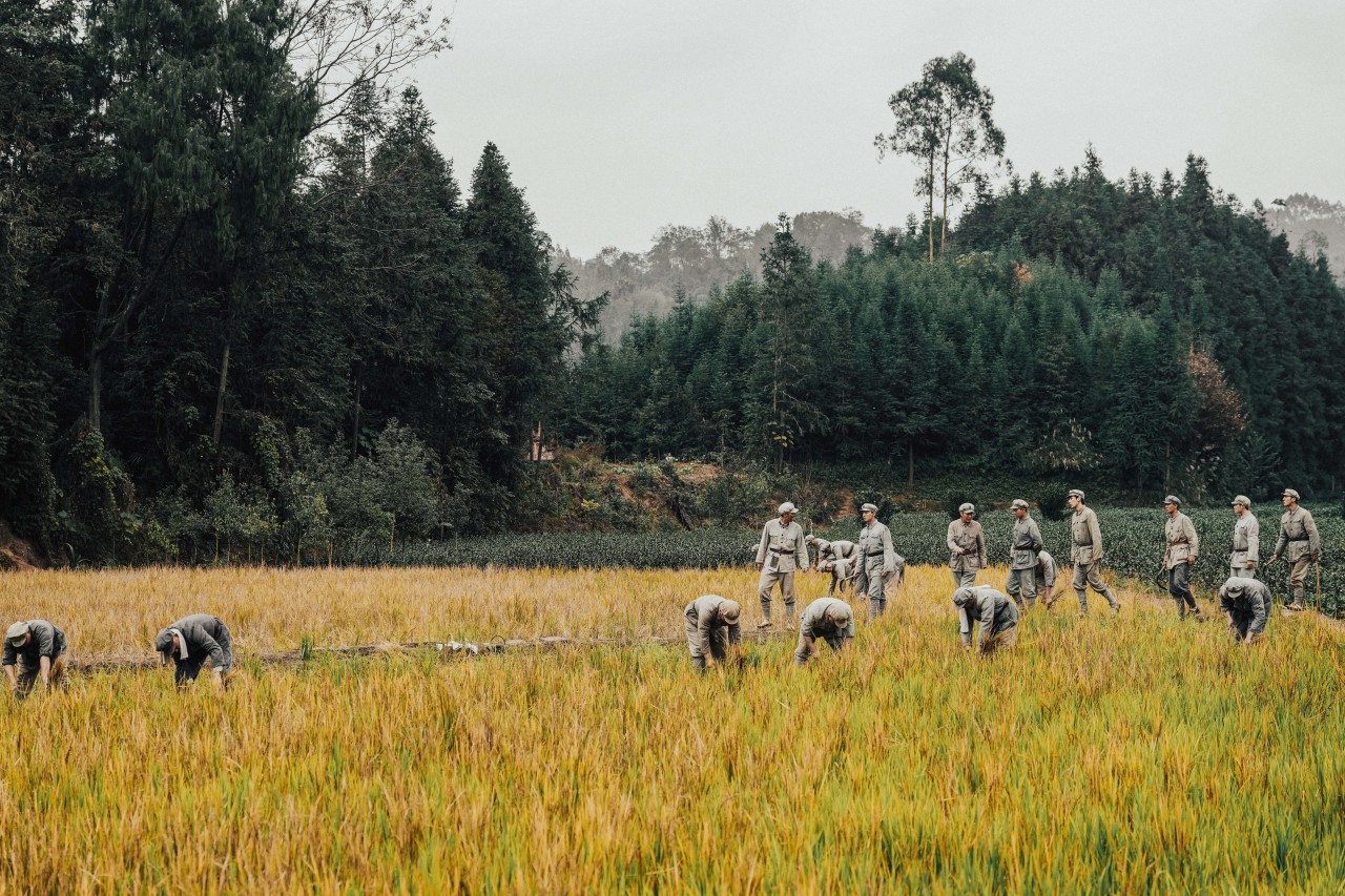 △ 《我叫张思德》剧组在柳江古镇曾家园(图一)、天府粮仓——柳江东岳示范片(图二)、中山镇汉王湖(图三)拍摄时的剧照。