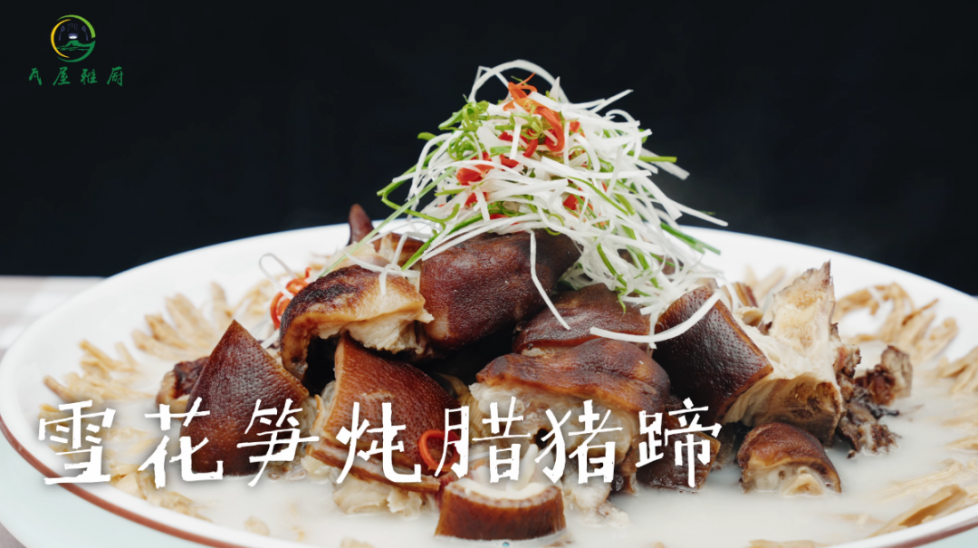 瓦屋山生态猪的烟熏猪蹄改块,加骨头汤小火慢炖三小时,再放入切好的雪花笋。猪蹄炖得软烂脱骨,雪花笋吸足了肉香,汤汁醇厚,一口下去,鲜得眉毛都要掉下来。