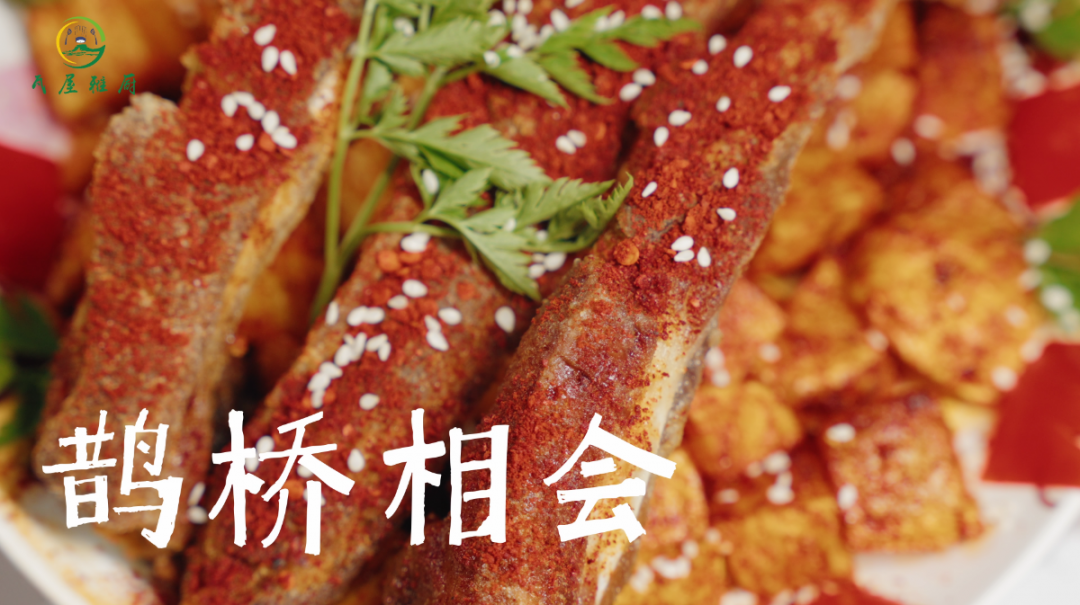 精选瓦屋山生态猪优质排骨,瓦屋农家土豆,排骨切条炸至金黄,土豆丁炸得酥脆。土豆铺底,排骨搭成拱桥状,撒上调料和芝麻,点缀红椒、香菜。排骨外酥里嫩,土豆香脆入味,造型亮眼,味道更是没得说。
