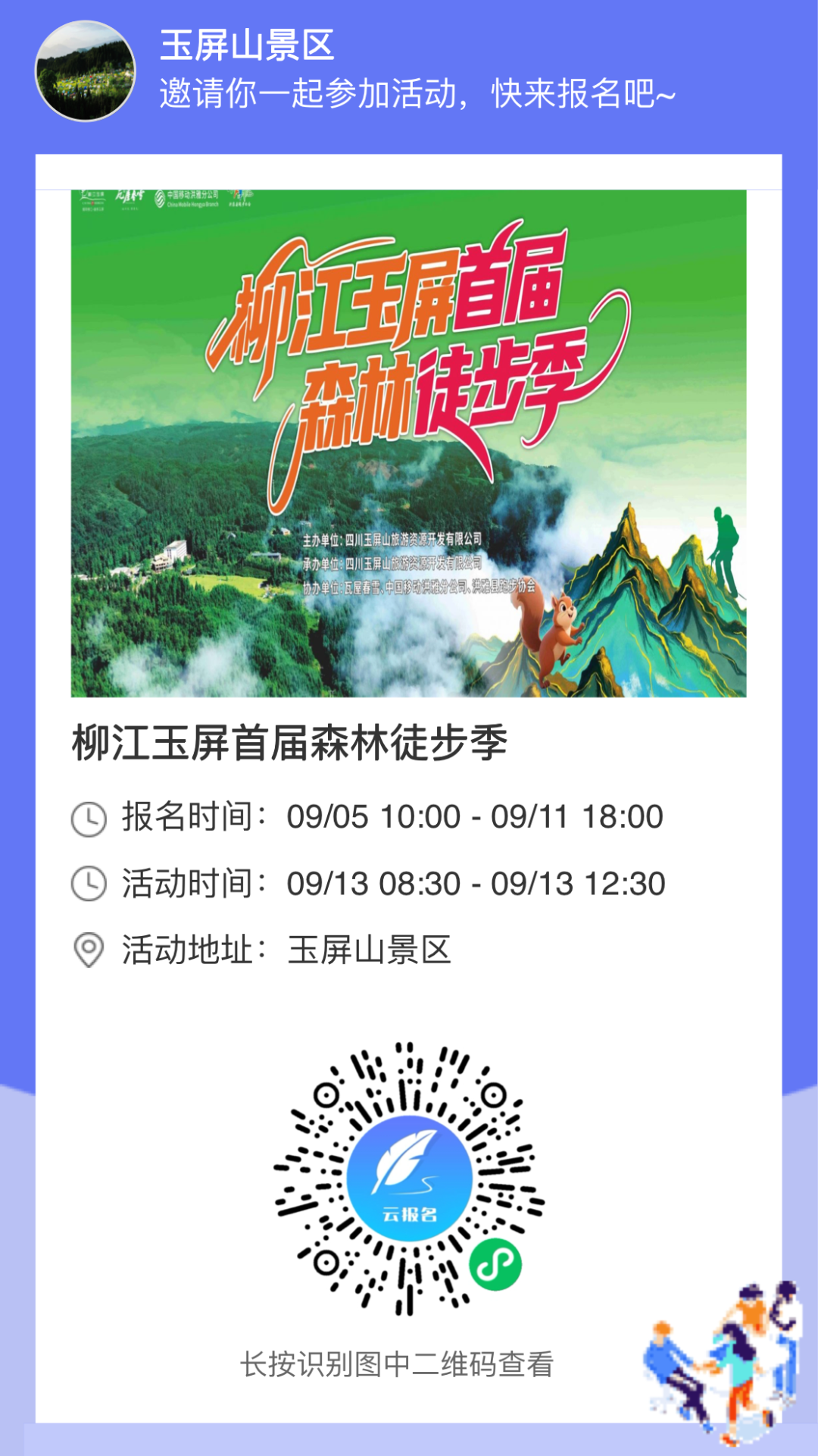 为深入贯彻县委县政府十五届十一次全体会议精神,推进文化和旅游深度融合发展、加快建设“国际生态康养旅游目的地,为推动全民健身运动,以徒步为载体,深度融合体育、旅游、文化,提升“柳江玉屏”的知名度和美誉度,特策划举办首届森林徒步季活动。
