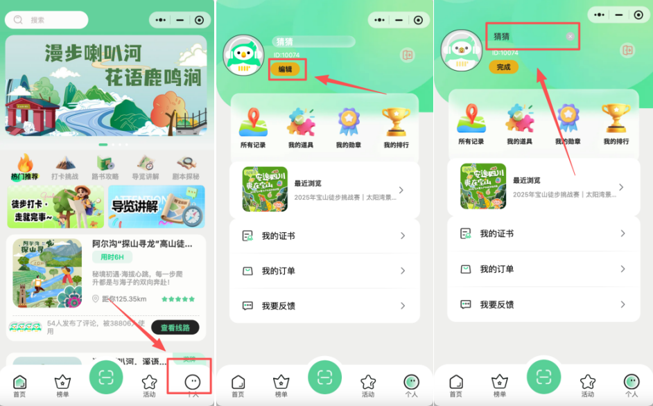 起点党校(集合点)处,打开微信扫描活动专属二维码,使用手机号授权登录进入小程序,进入后,依次点击右下角“个人”—“编辑”—“昵称”,将昵称更改为自己的参赛号码以便统计成绩,修改后点击完成。明枪后扫码打卡出发,开始计时。