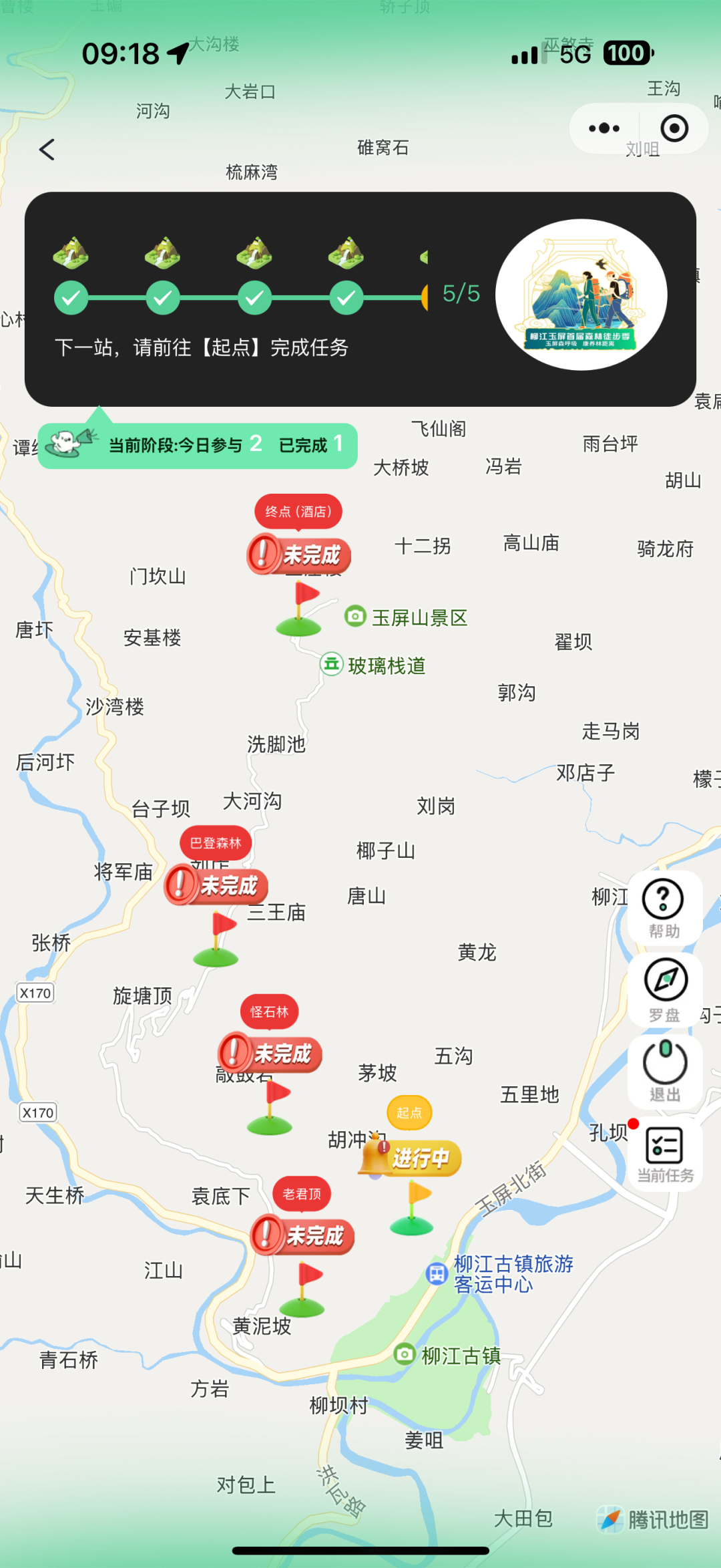 打卡点共设置5个:起点、老君顶、怪石林、巴登森林、终点。