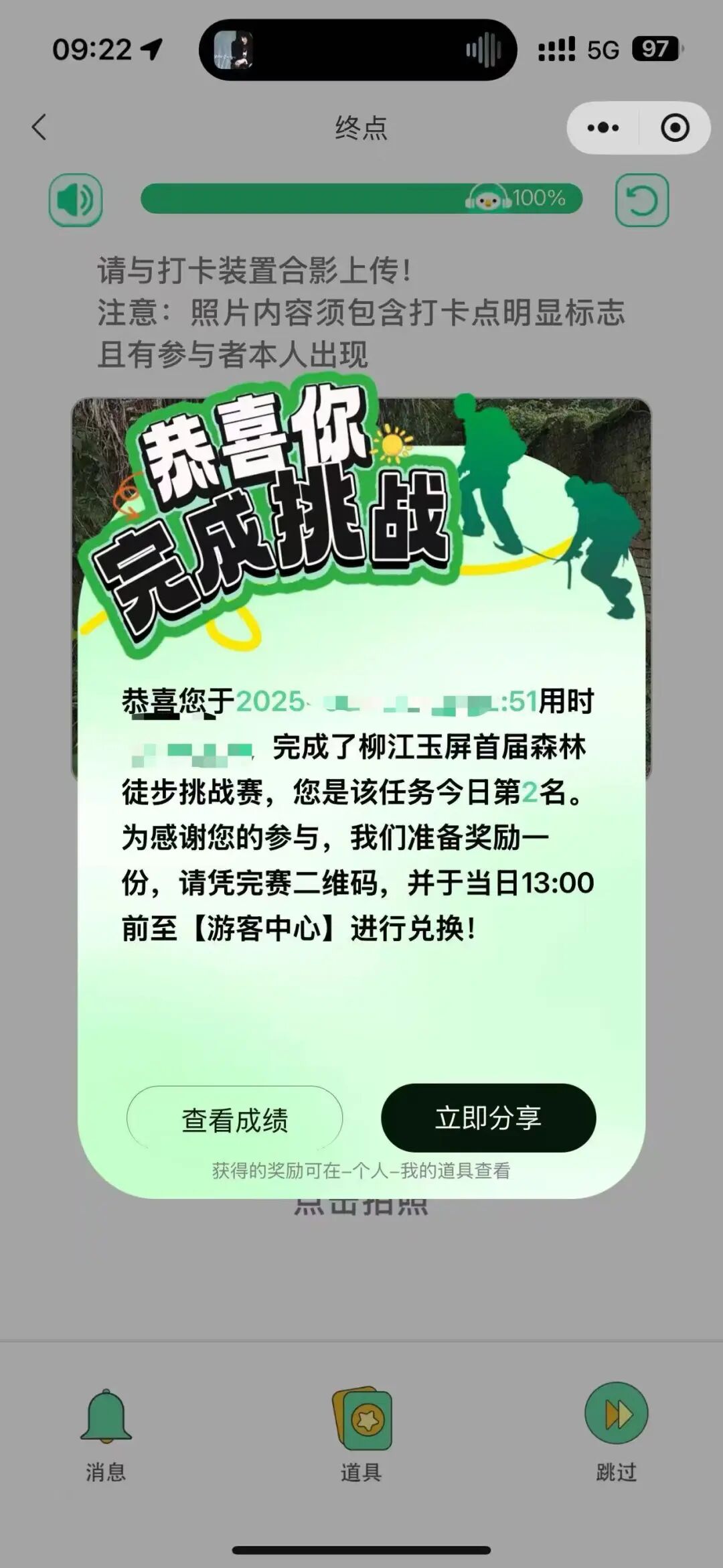 全部打卡完成后,系统将显示本次活动总耗时的排名信息,并自动生成个人完赛二维码。