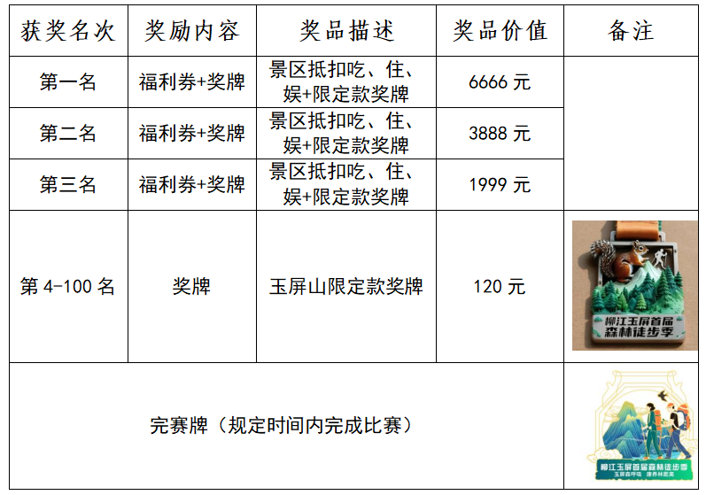 活动分别设置男女前三名,分别获得价值人民币6666、3888、1999元的玉屏山景区抵扣券;前100名参赛选手获得限定款专属奖牌;完赛选手获得定制款完赛奖牌。