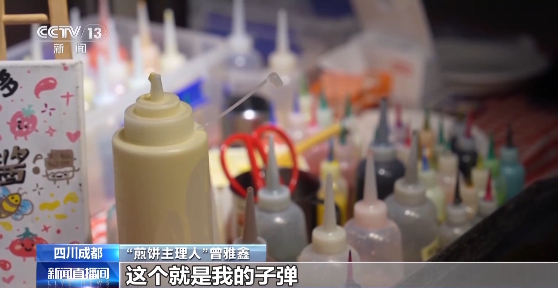 “煎饼主理人” 曾雅鑫:这个就是我的“子弹”,是由鸡蛋、牛奶、面粉,还有各种果蔬形成的材料。大概有二三十种颜色。