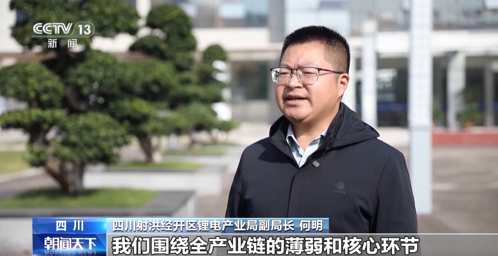 四川射洪经开区锂电产业局副局长 何明:我们围绕全产业链的薄弱和核心环节,目的是形成一个产业生态圈,让企业之间能够‘隔墙供应’,降低物流和沟通成本,形成集群竞争力。