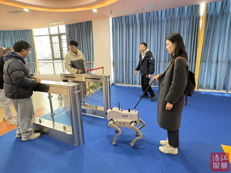 这期间,只见吴军捏着“牵引绳”走在后面,小飞则不慌不忙地移动四肢,沉稳地带他精准走上讲台,完成发言后又安全引导他回到座位,整个过程流畅自然。
