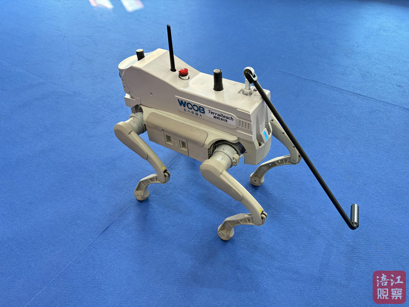 记者在现场看到,小飞和传统的四足机器人相比,它的个头看起来要稍微小一点,其后背伸出的装置上套着一根类似于手杖的东西方便手握,正前方突出的黑色部分,犹如一只大大的“眼睛”,显得呆萌又显眼。