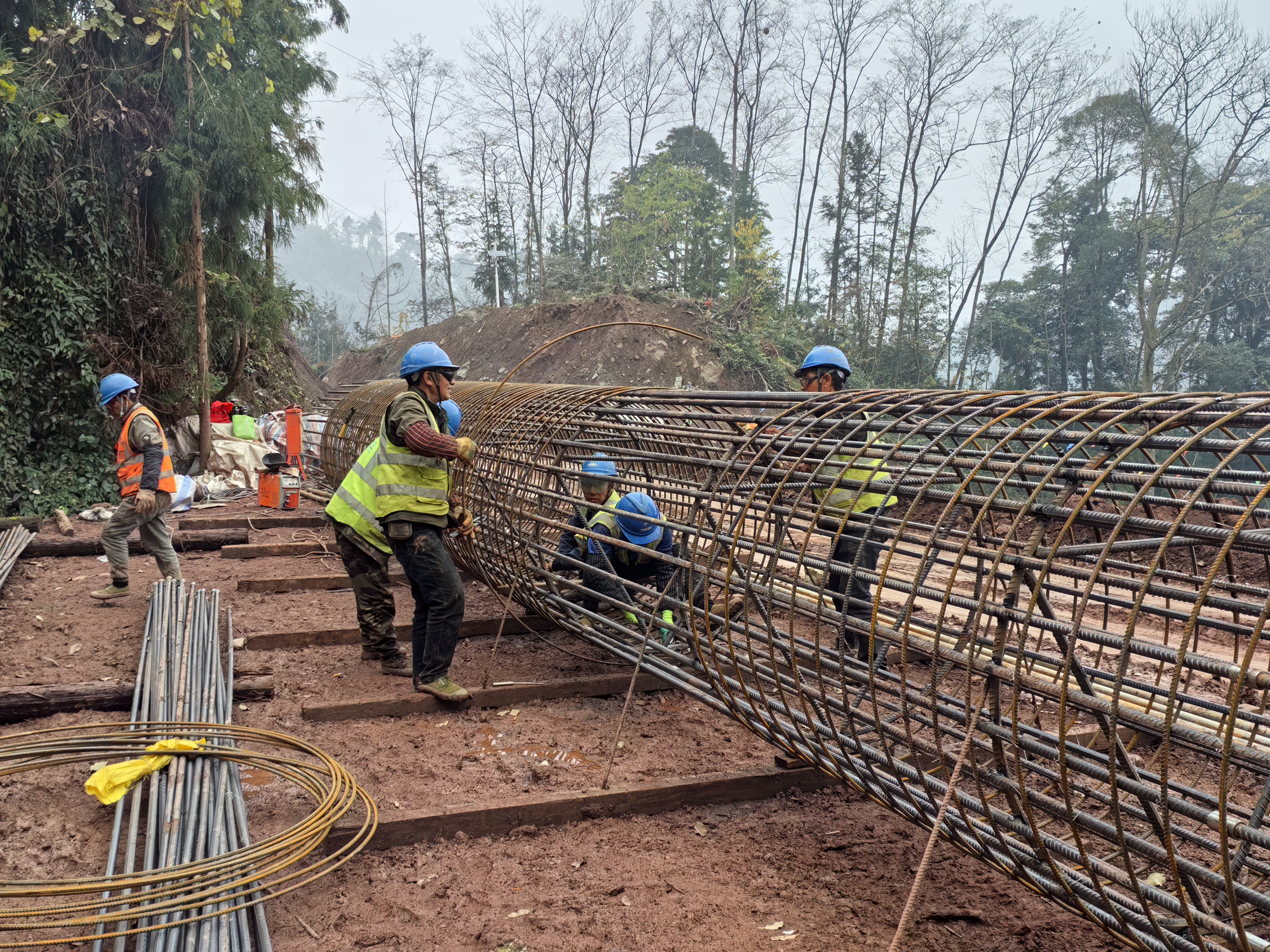 在K2+45段、牛山2号桥和K+812到836段,工人们正在进行抗滑桩、桥梁下部结构、衡重式路肩墙及钢筋笼施工,各作业面均有监理人员全程旁站监督,以确保施工质量和安全。