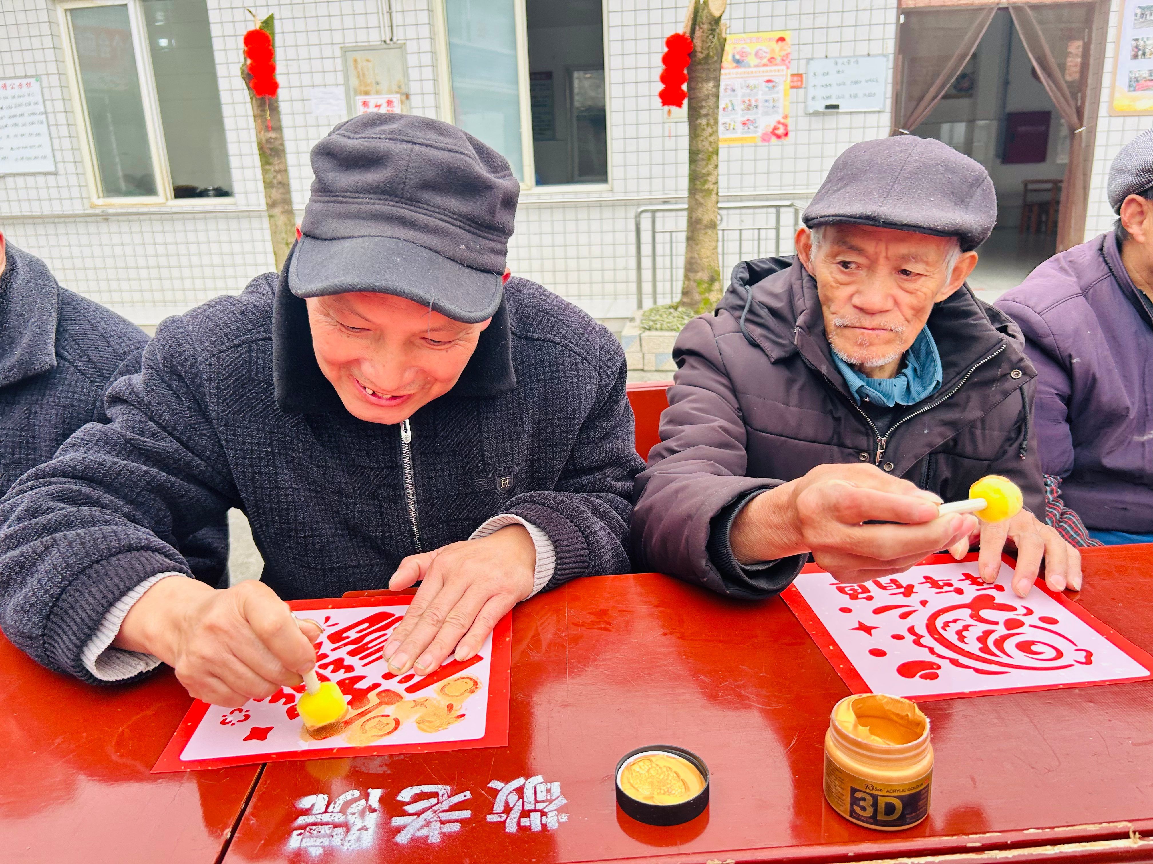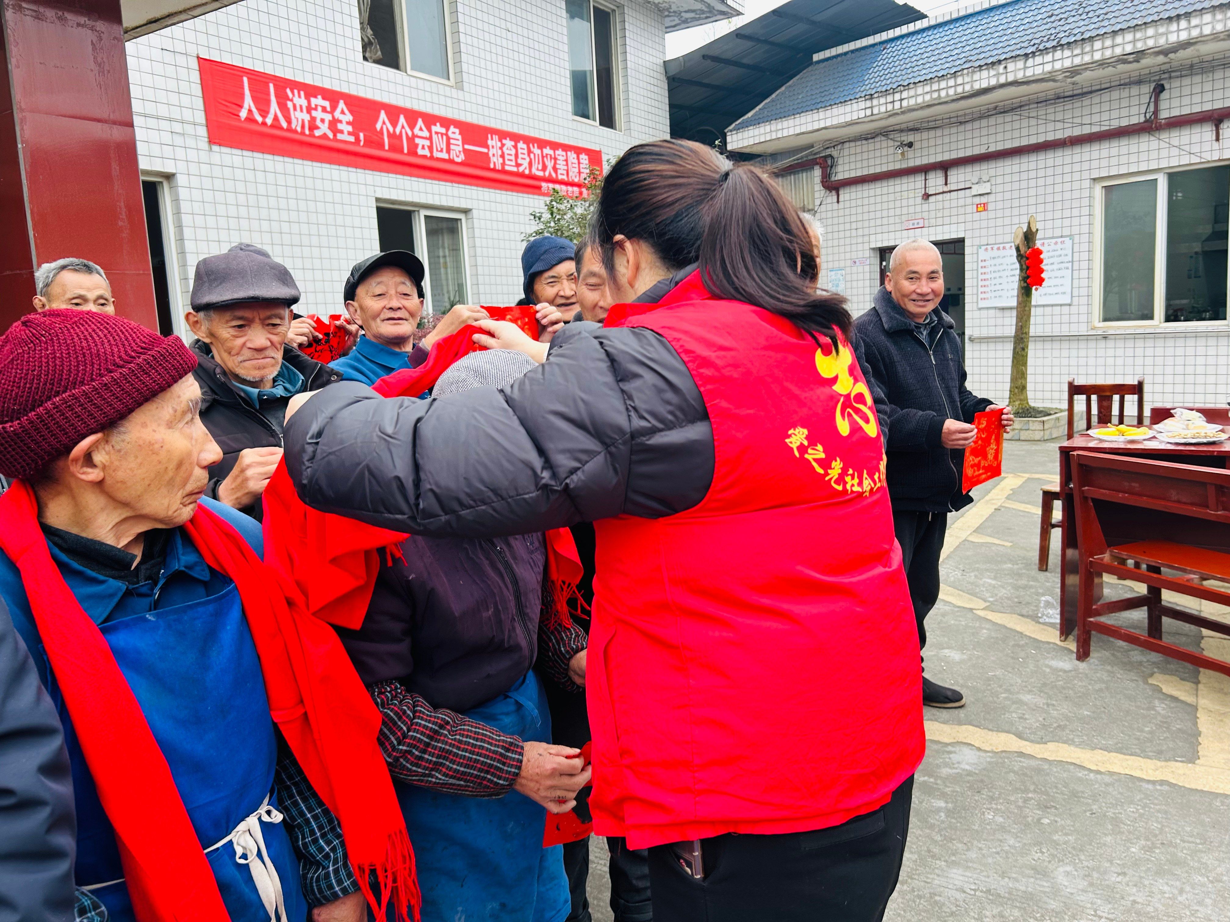 活动从一场安静的“拓福”开始。在志愿者一对一的协助下,长者们凝神静气,将金色的“福”字稳稳拓印在朱红纸上。这不仅仅是一次手工体验,更像是一场连接传统与当下的心灵仪式。“手有点抖,但心里高兴。”一位爷爷展示着自己的作品,笑容里满是成就。随后,志愿者们为每位老人系上柔软的新围巾。一抹亮色跃然颈间,犹如一道温暖的拥抱,无声诉说着来自社区的牵挂。