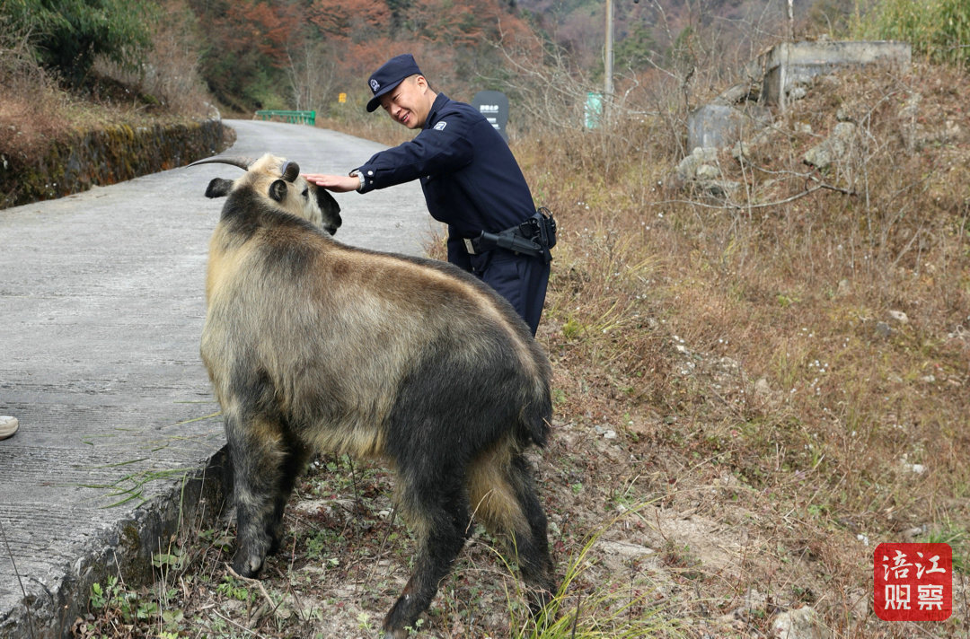 平武县公安局古城派出所所长张浩介绍,当天巡护车辆驶入保护区仅几分钟,“王德福”便慢悠悠地走向警车。“它像见到老朋友一样,慢慢靠近我们,还用头蹭我的手。”张浩说,一人一牛就这样互动了好几分钟,“王德福”才摇摇脑袋蹦跶着走进林区深处。
