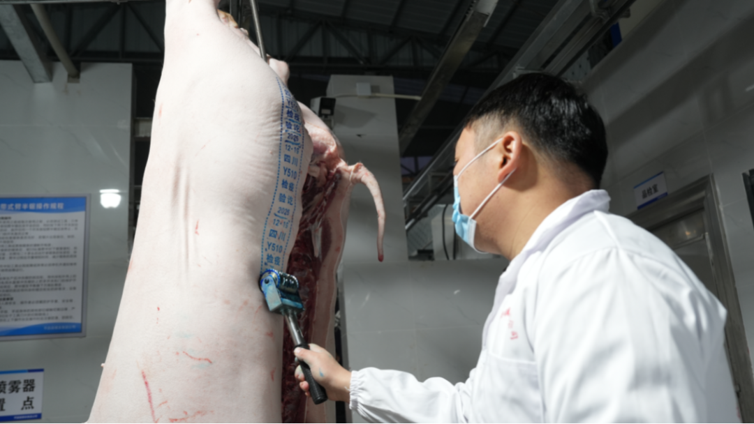 何军松精准切下猪后腿部位的淋巴结仔细观察,又到内脏处理区逐一核查,确认无异常后,在猪胴体上盖上检疫合格章。“从入场检疫到出厂溯源,每一头都要过‘体检关’,让群众吃得放心。”他一边在台账上记录数据,一边对记者说。