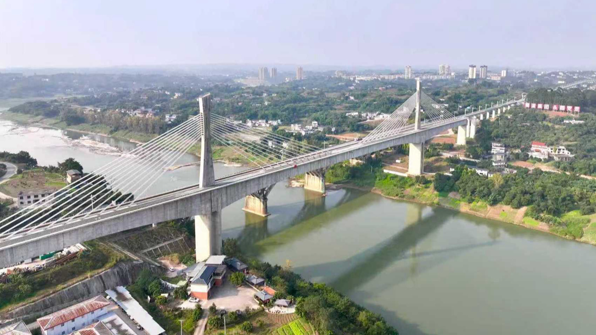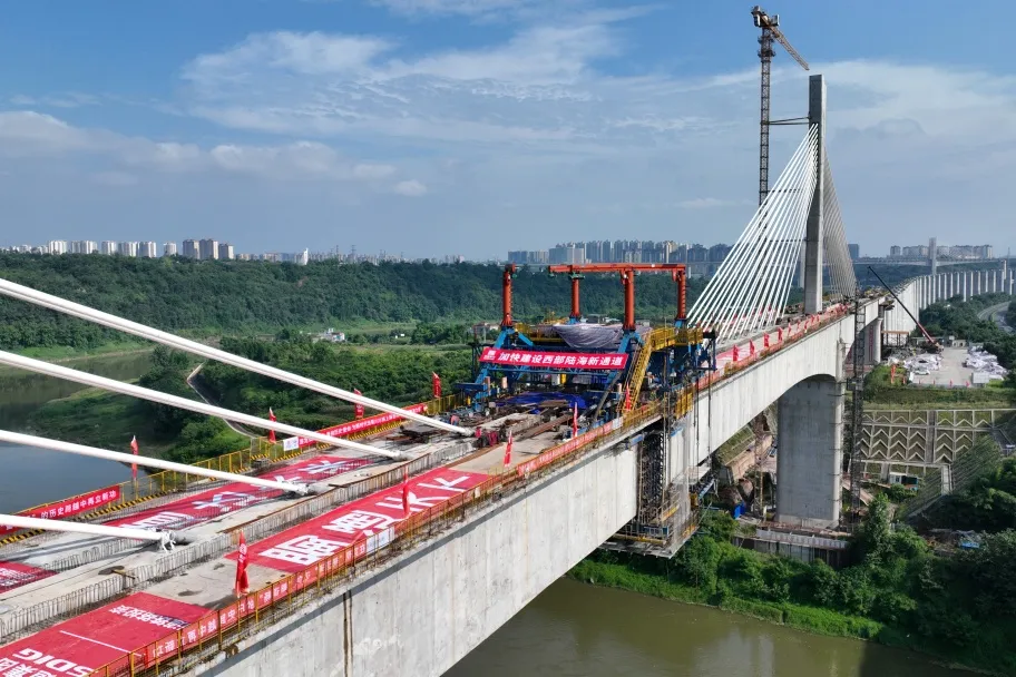 全线新建23座隧道,而新江门二号隧道、新响水函一号隧道穿越泥岩地层,这类地层遇水易软化,极易引发坍塌。建设者创新研发“泥岩地层单线铁路隧道安全高效机械化施工技术”,通过超前地质预报、机械化支护等手段,不仅保障了围岩稳定,还将隧道施工效率提升20%;104座桥梁中,泸州金山沱江铁路大桥最为亮眼,这座大桥跨越沱江主航道及水生珍稀鱼类保护区,主桥全长为2408.72米,是国内首次采用W形截面的铁路斜拉桥,为国内最大跨度的铁路单索面斜拉桥。胡市镇特大桥下穿绵泸高铁内自泸段、上跨车水马龙的厦蓉高速,在安全浇筑完成重达5300吨的简支拱后,整体落梁1.5米,创下国内铁路桥梁高位落梁的最大重量纪录。