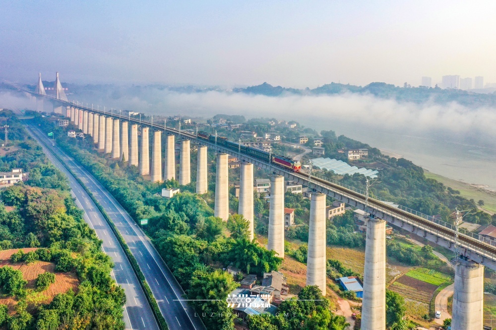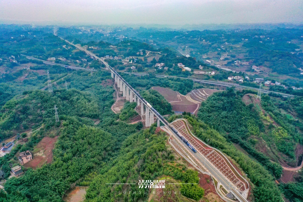 2025年6月10日,在泸州市江阳区方山镇云峰村附近,西部陆海新通道隆泸叙铁路与G76厦蓉高速公路“同框”。