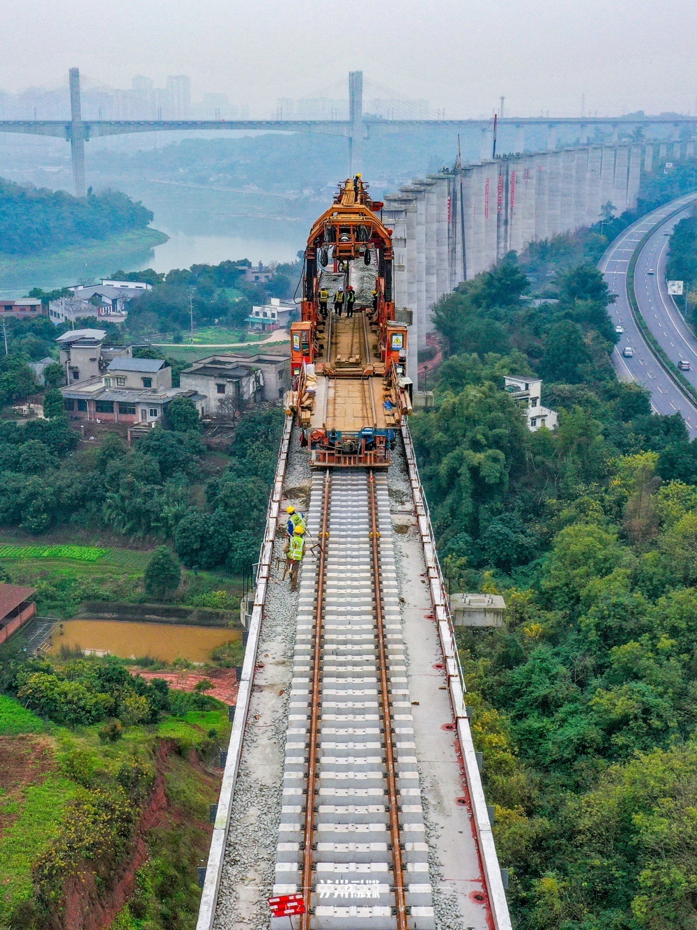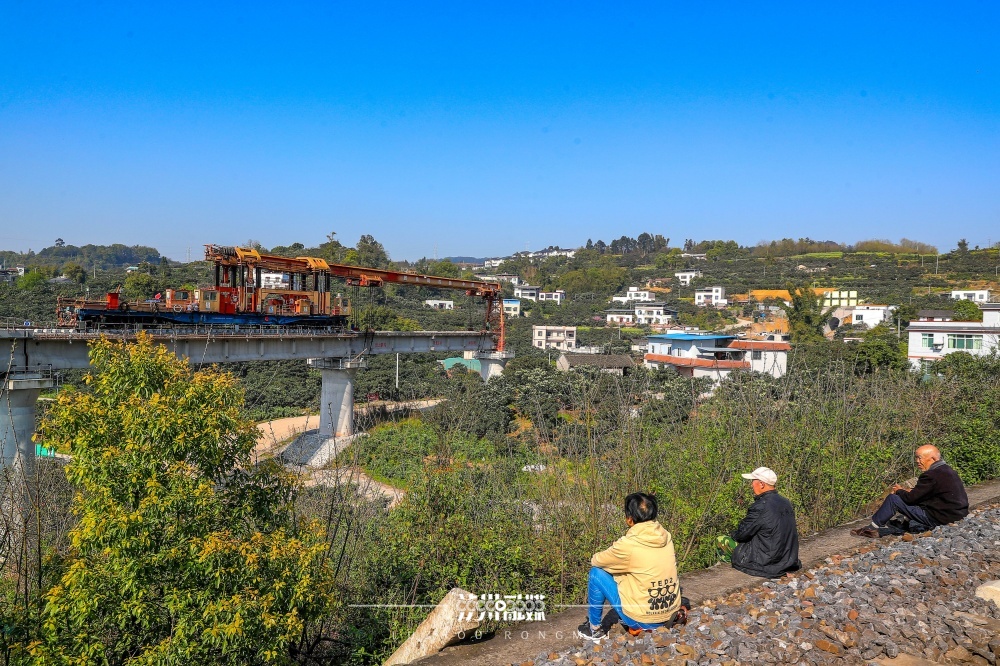 2025年3月25日,在泸县玉蟾街道白龙塔村境内,西部陆海新通道隆泸叙铁路正在吊装架梁,全线836孔梁已完成过半。