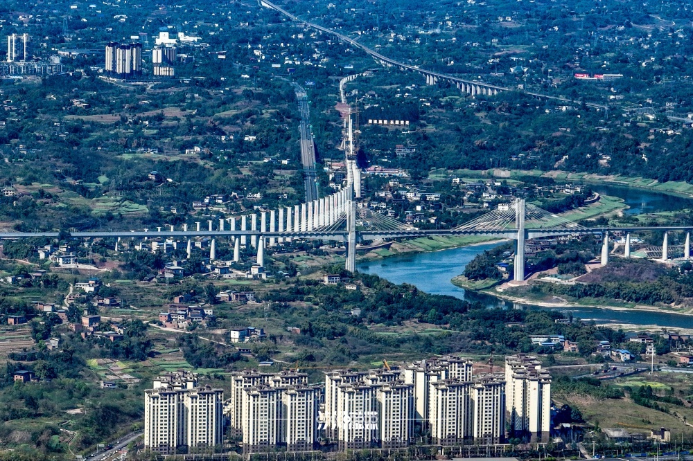 2025年12月15日,在叙永县马岭镇三块石村,西部陆海新通道隆泸叙铁路、隆黄铁路既有线、G76厦蓉高速公路与远处的永宁河、国道321线“五路同框”。