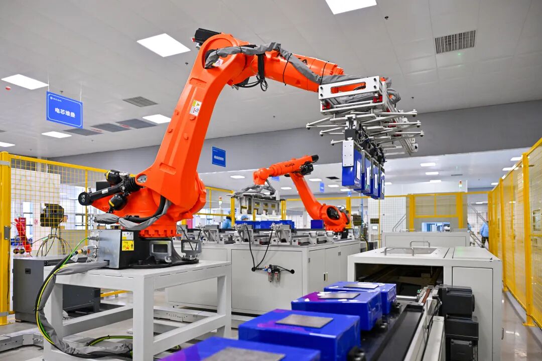 位于眉山仁寿经济开发区的储元世纪,自动化生产车间内,机械臂正在搬运电池模组。