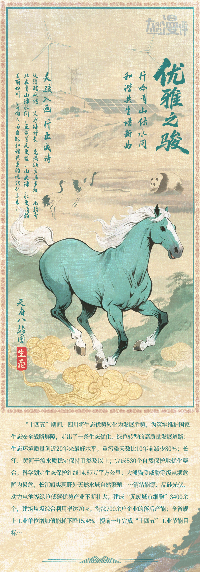 既降碳减污,又扩绿增长,充满活力与生机。此骏奔驰在青山绿水间,正载着天更蓝、山更绿、水更清的美丽四川,奔向人与自然和谐共生的现代化未来。